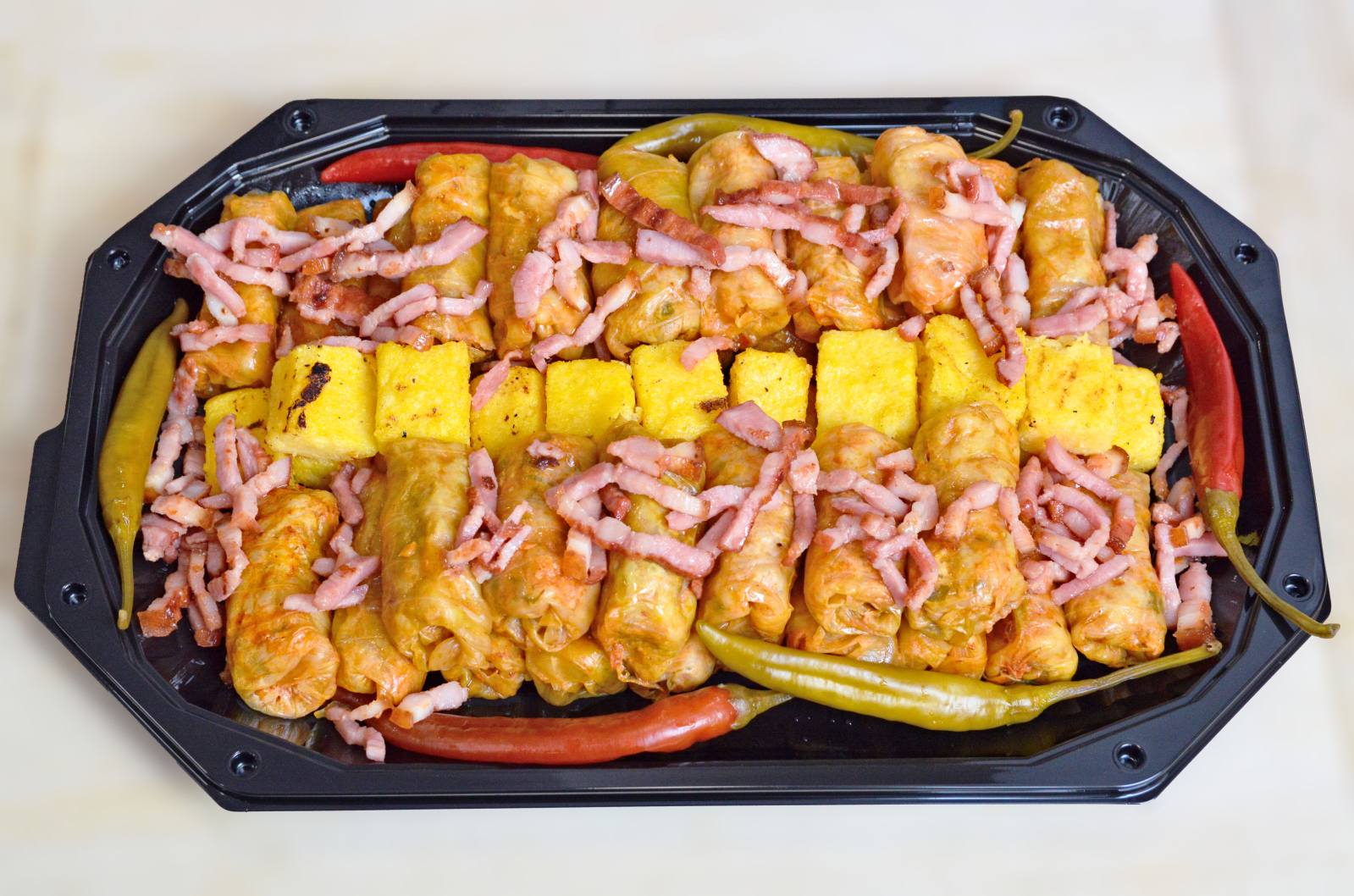Platoul contine 32 de sarmalute moldovenesti delicioase, cu carne de porc, insotite de culubete de mamaliguta, ardei iute si presarate cu kaizer rumenit la tigaie.