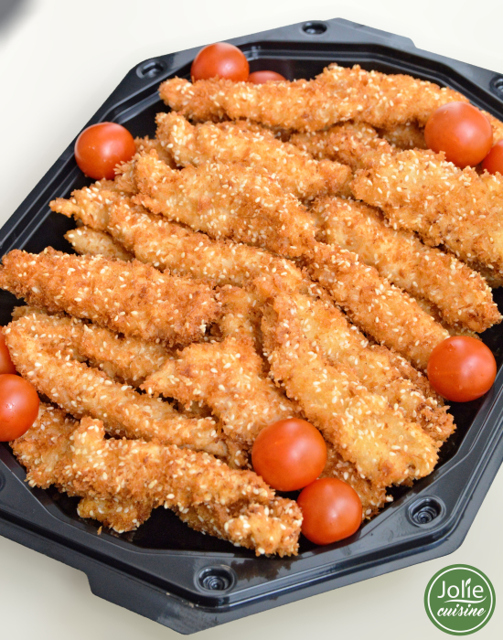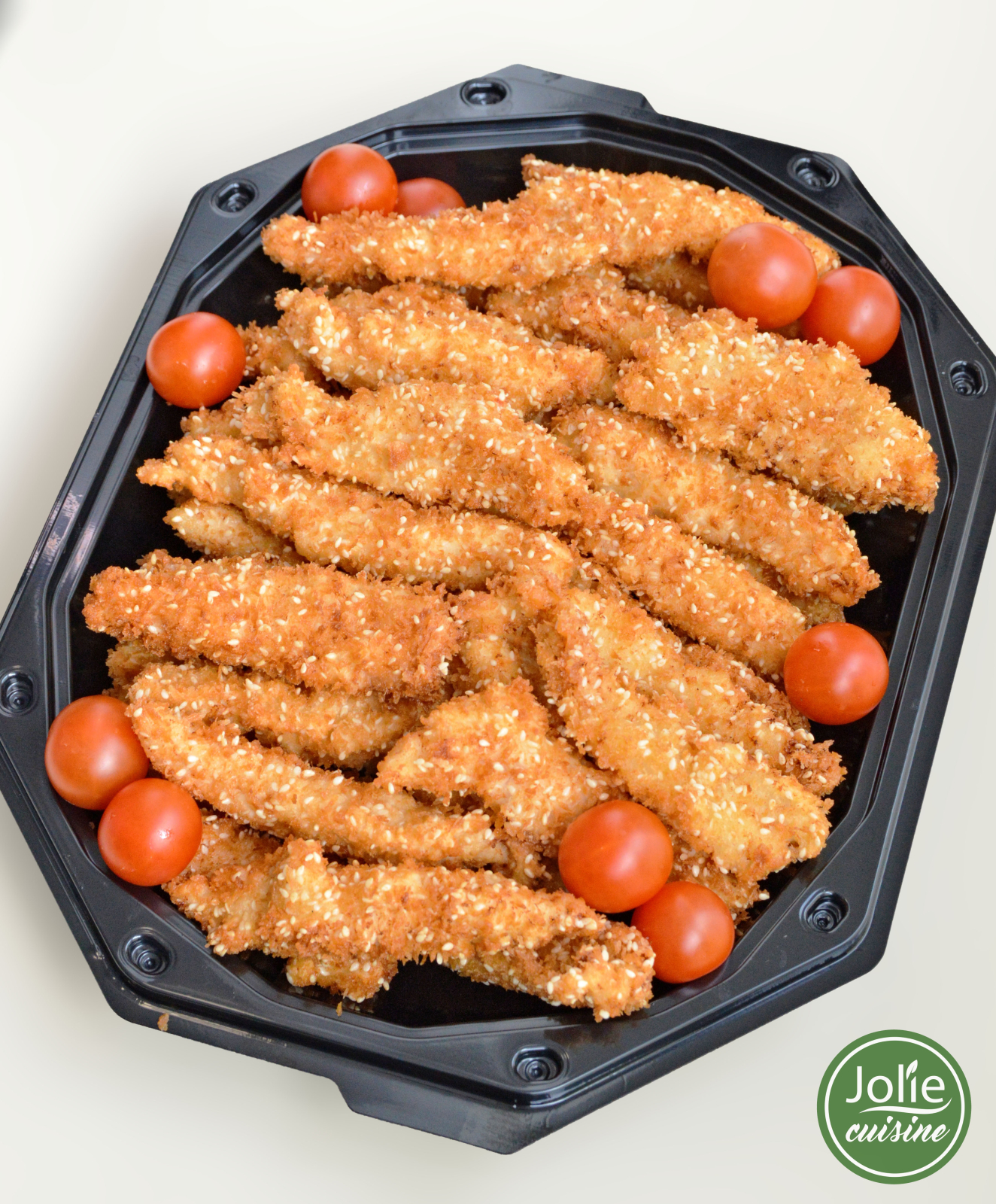 Conține: piept pui, pesmet, ou, susan, faină, sare, ulei.