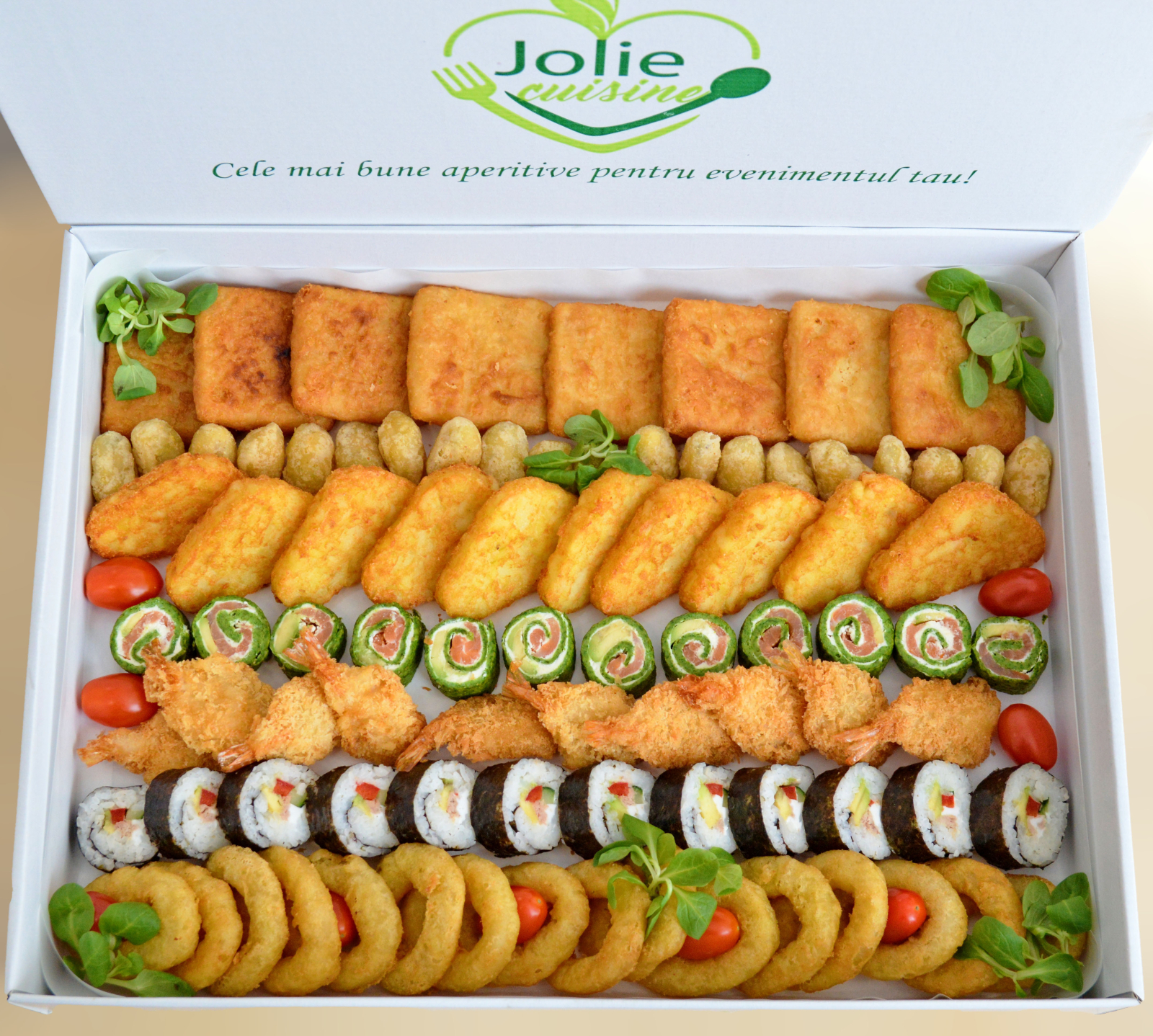 Platoul contine: sushi cu ton, rulada cu somon, spanac si crema de branza, creveți butterfly, merluciu pane, inele de calamar, midii pane, cartofi triunghi, roșii cherry.