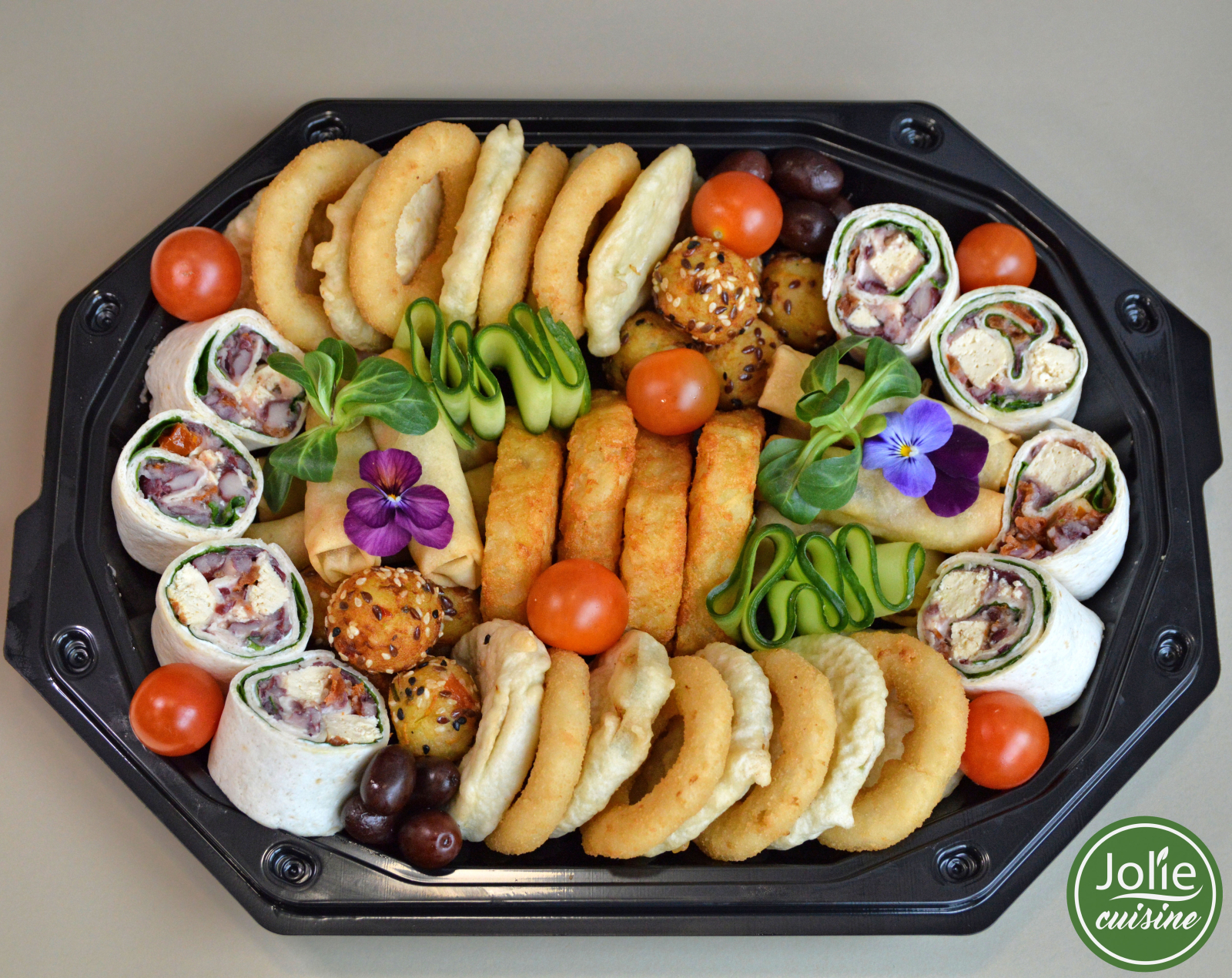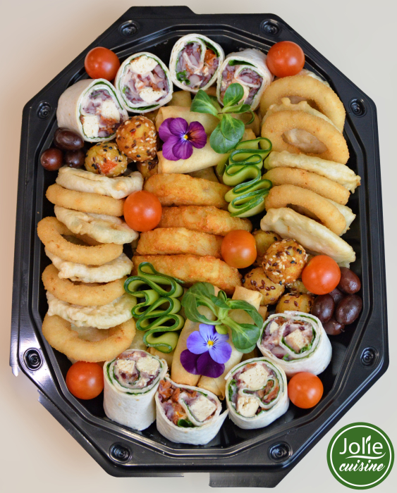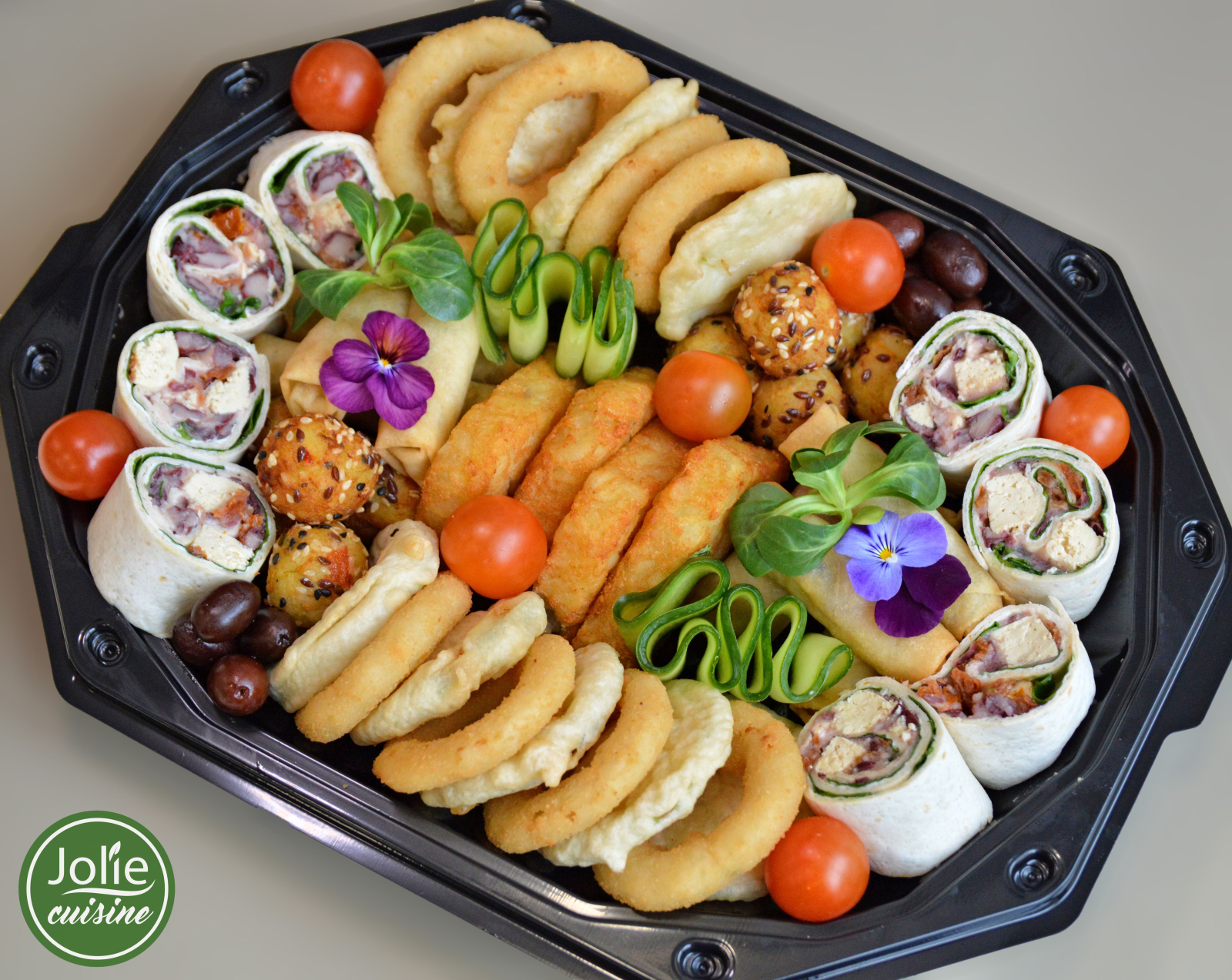 Platoul contine: ruladă de legume, cartofi hash browns, pachețele de primăvară, crochete de legume cu semințe, inele de ceapă, dovlecel pane, măsline, roșii cherry, castravete.