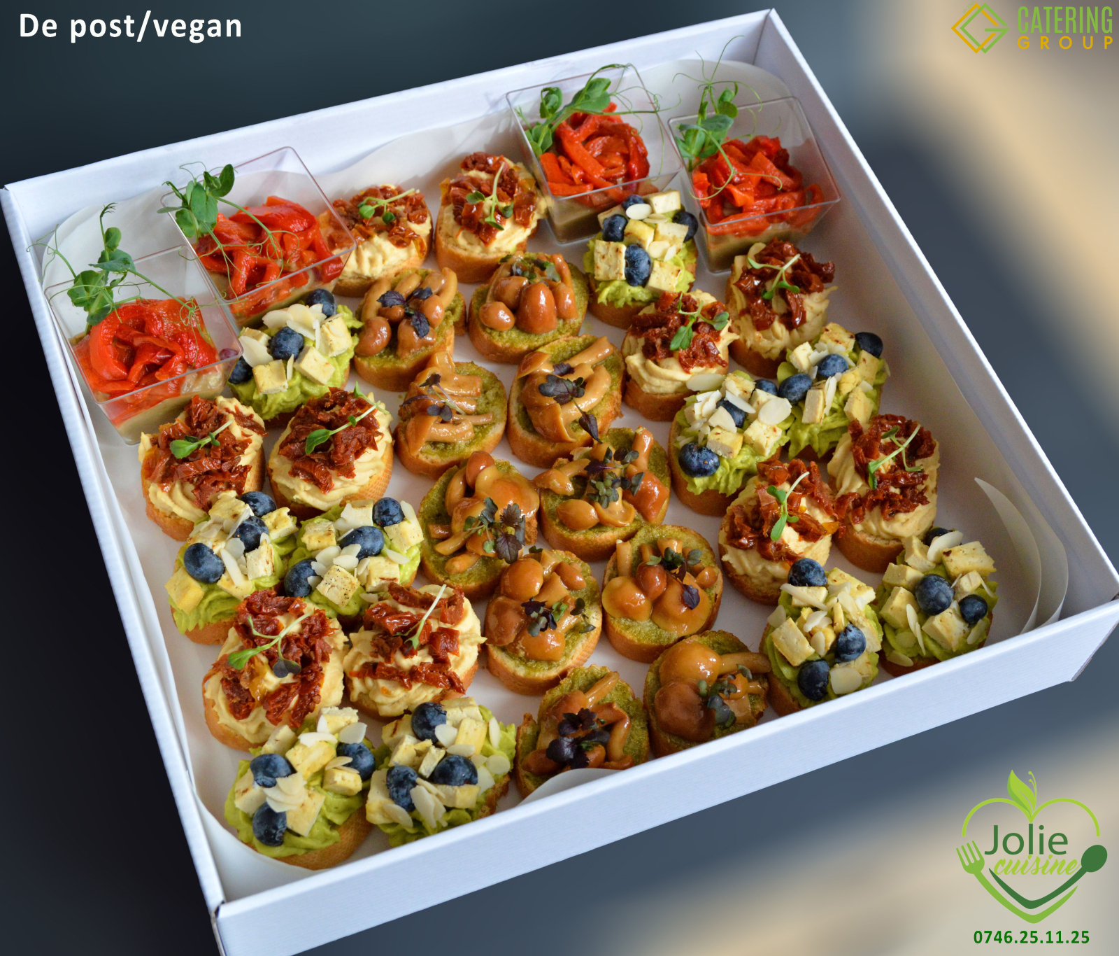 Contine: salata vinete, ardei copti, humus, avocado, tofu, rosii deshidratate, afine, fulgi migdale, pesto, ciupercute, rosii cherry, biscuiti crakers, bagheta frantuzeasca.