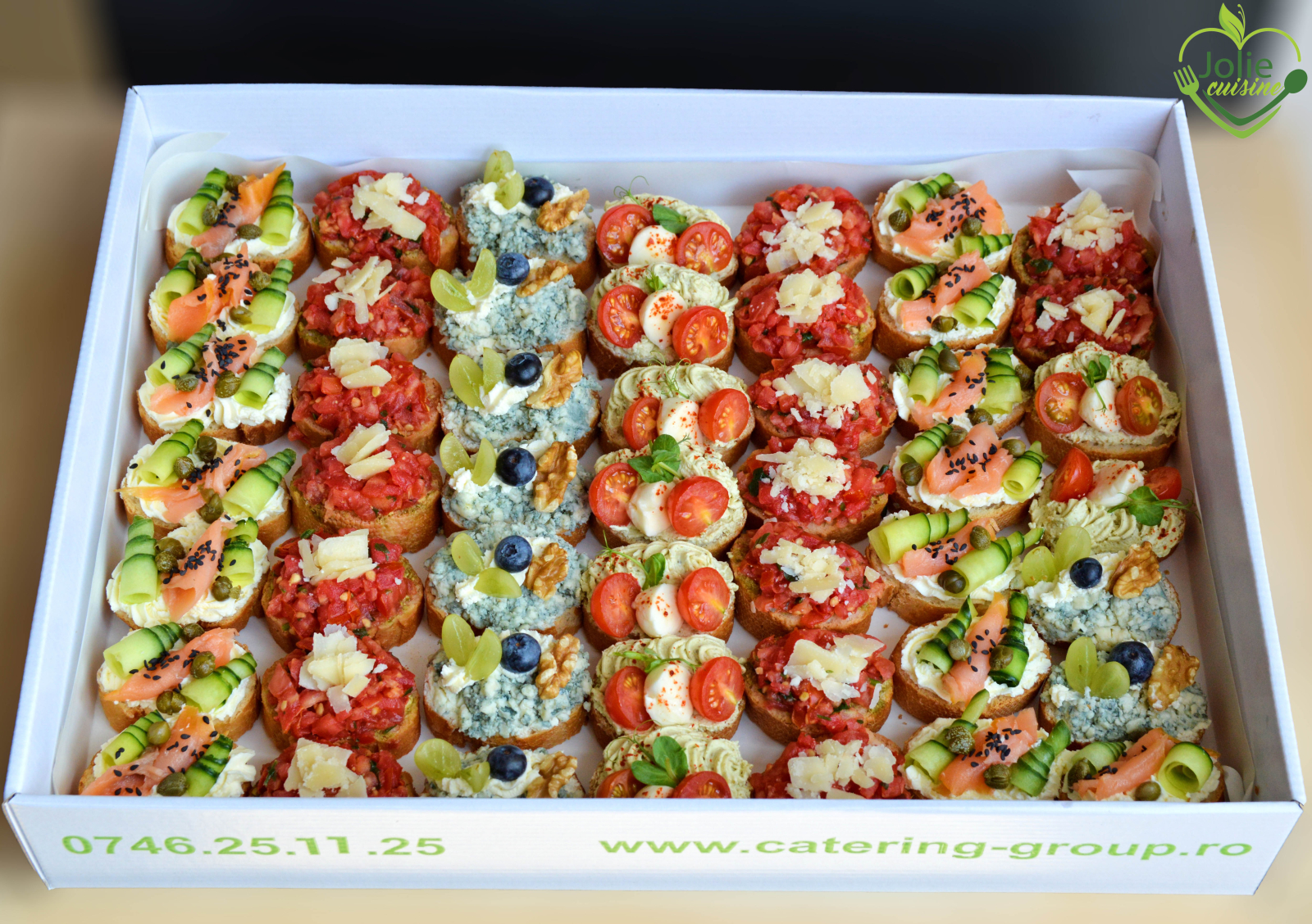 - Bruschete cu somon afumat, cremă de brânză, capere și castravete